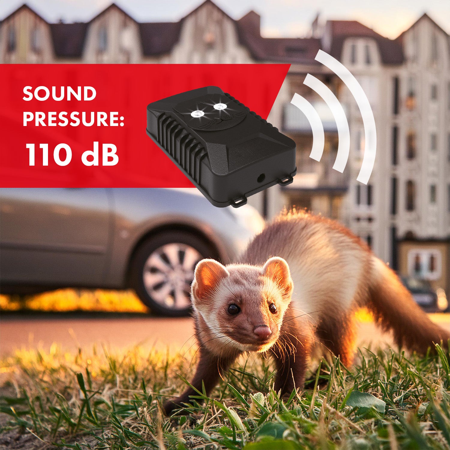 A változó frekvenciájú ultrahang ártalmatlan a kutyákra, macskákra és más háziállatokra, ugyanakkor hatékonyan riasztja el a rágcsálókat és a márnákat. A repellens közvetlenül az autó akkumulátoráról, akkumulátorról működtethető, a mellékelt USB-kábel pedig lehetővé teszi a készülék hálózatról történő táplálását is.