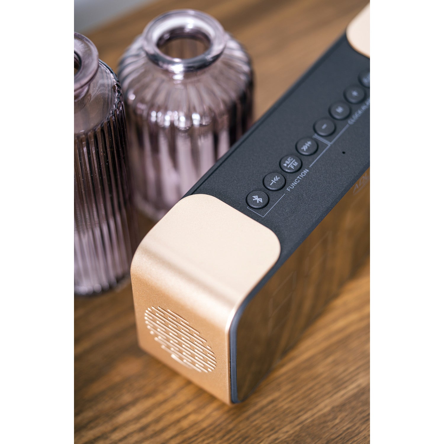 Az Adler AD 1190 Copper rádió ébresztőóra modern kialakítással és funkcionalitással rendelkezik. Kompakt méretei miatt bármilyen helyiségbe tökéletesen illeszkedik, anélkül, hogy sok helyet foglalna. A beépített FM vevővel kedvenc rádióállomásait hallgathatja, a Bluetooth funkció pedig lehetővé teszi, hogy más eszközökről vezeték nélkül zenét hallgasson.