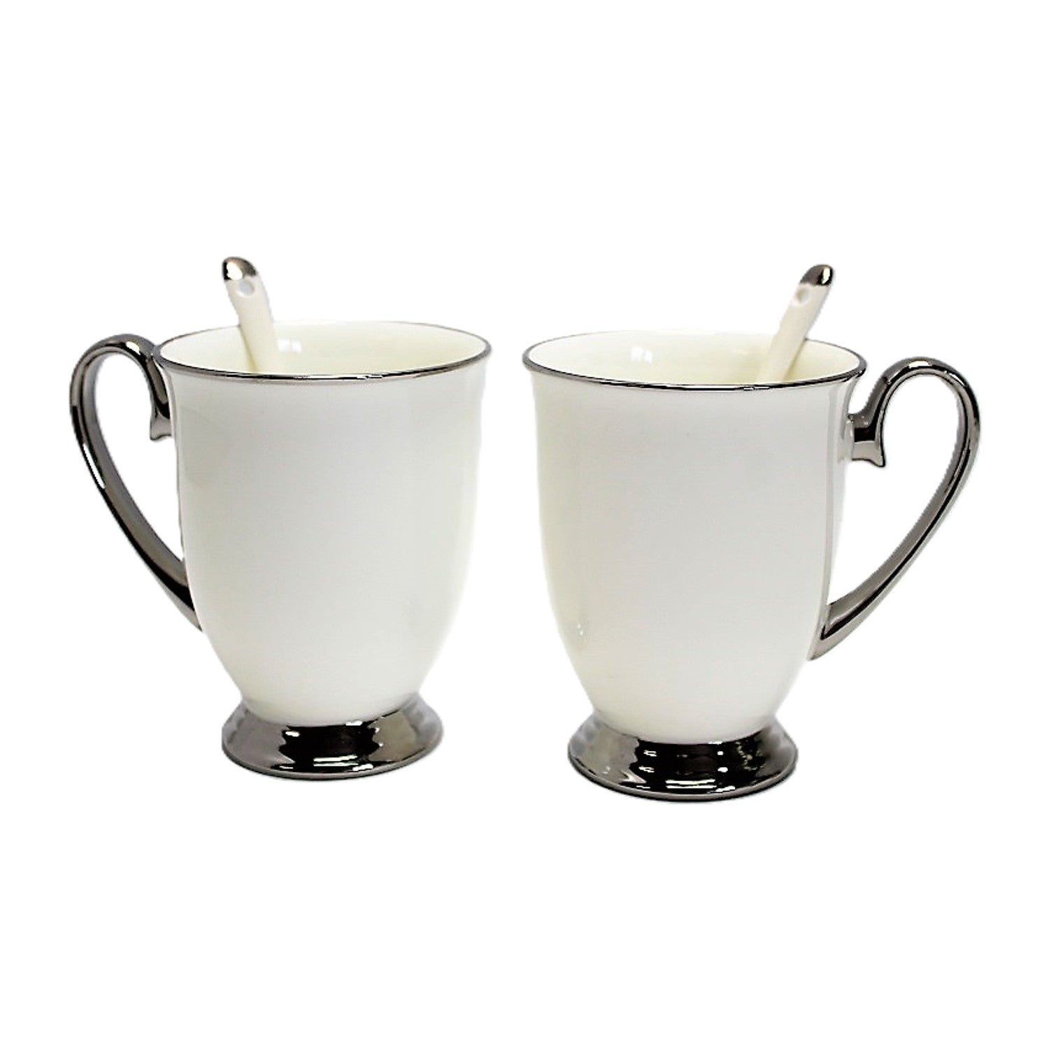 Fehér bögrék 2db krómozott fogantyú, teáskanál, porcelán, Elegáns, Queen Isabel
