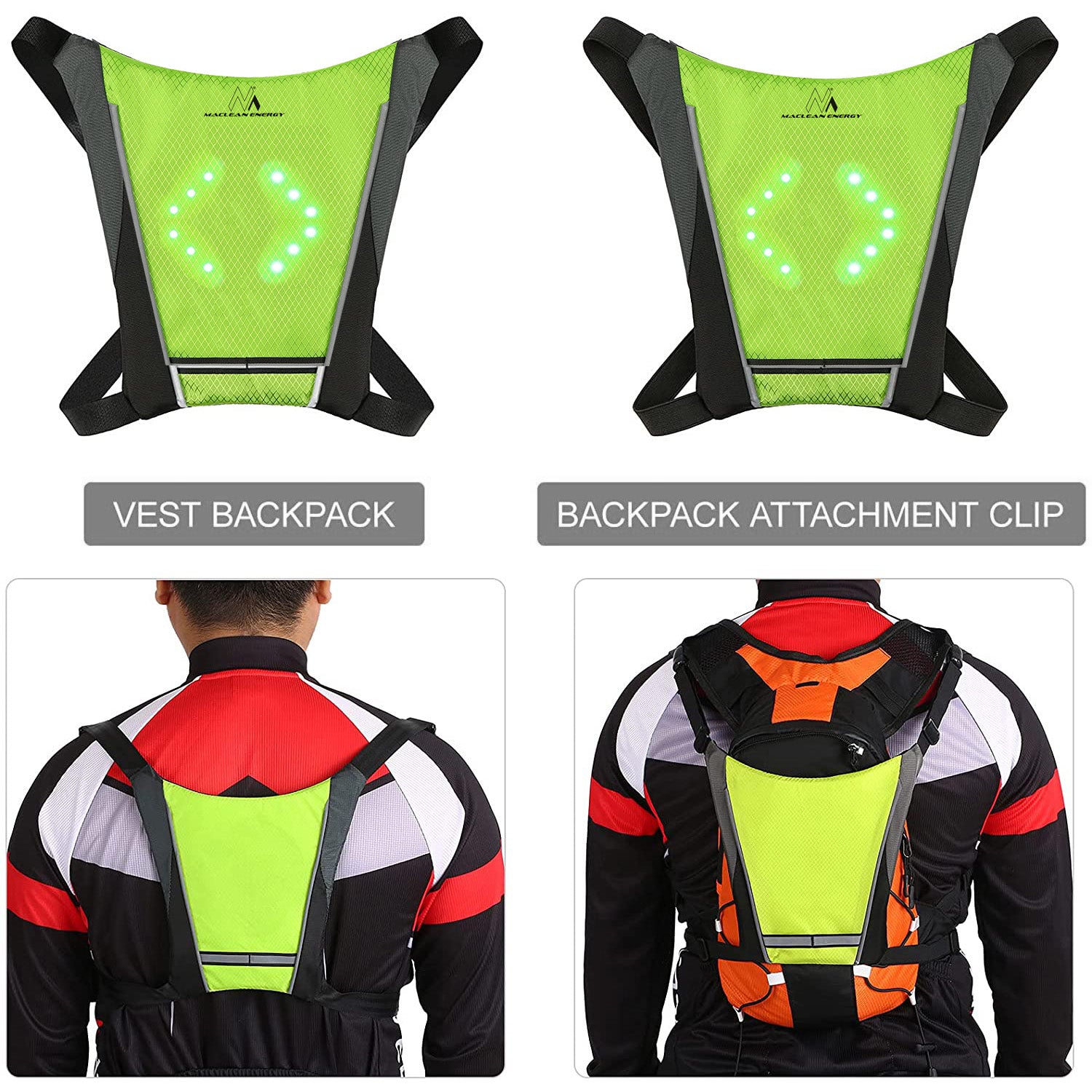 Az MCE420 mellény vezeték nélküli távirányítóval vezérelhető, és figyelmeztetéseket jelenít meg az előrehaladásról, a balra és jobbra kanyarodásról, valamint a megállásról, így a felhasználó figyelmeztetéseket jeleníthet meg (a mögötte lévő embereknek vagy autóknak). Nagyon hasznos kerékpározás, hegymászás, túrázás és egyéb szabadtéri sportok során. A mellény növeli a biztonságot és jobb láthatóságot biztosít nappal és éjszaka egyaránt. Hátizsákra is rögzíthető.