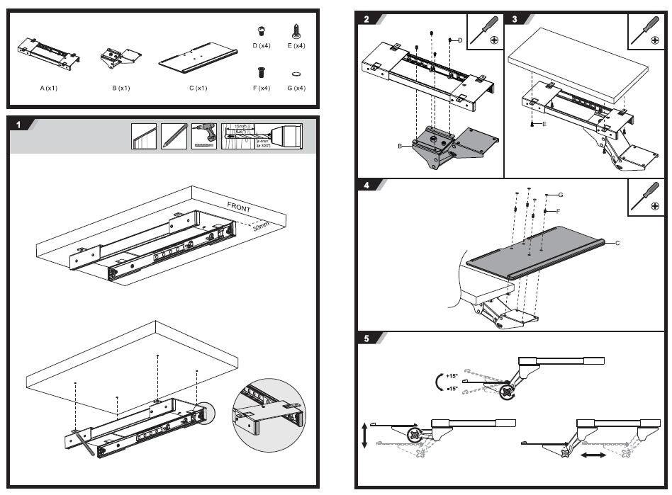 - Dőlésszög beállítása: -15°-tól +15°-ig - a fel- vagy lefelé dőlés ergonomikus pozíciót biztosít, és csökkenti a csukló megterhelését.