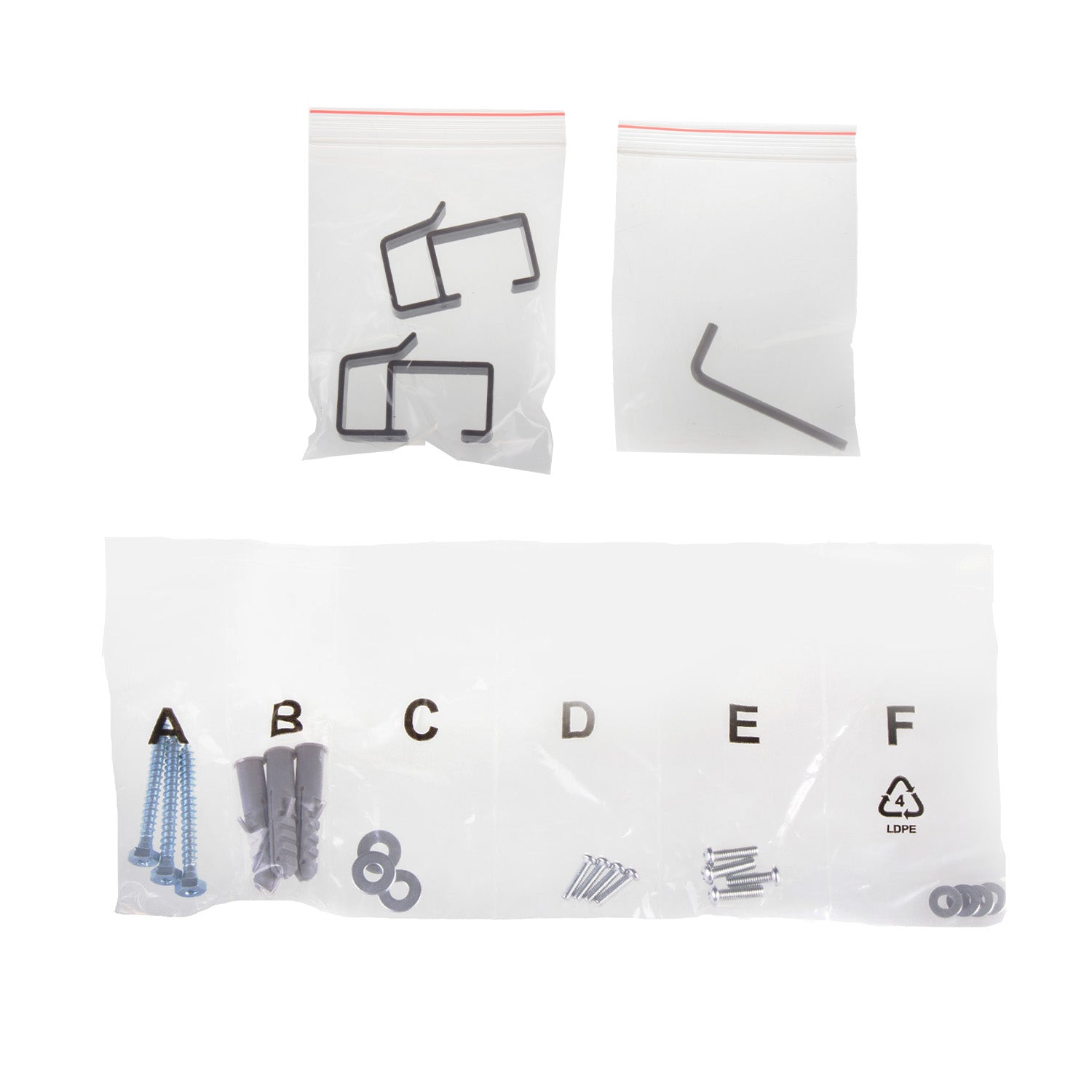 A csomag tartalmaz egy csavarkészletet a konzol falra és a TV-t a konzolra történő rögzítéséhez, valamint a telepítési útmutatót.