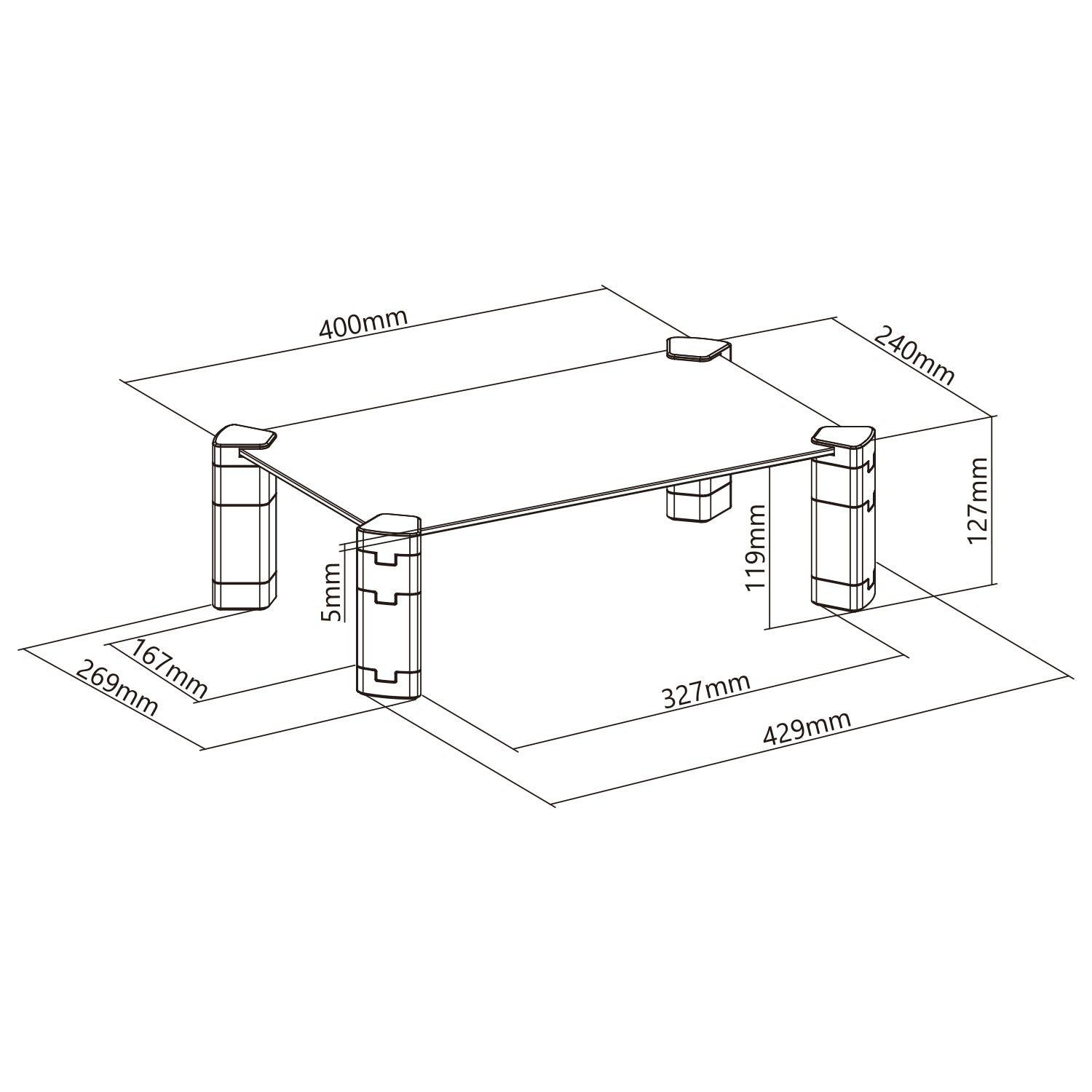 Az 5 mm vastag edzett üveglap szilárdságot biztosít a 20 kg-ig terjedő súlyú eszközök számára.