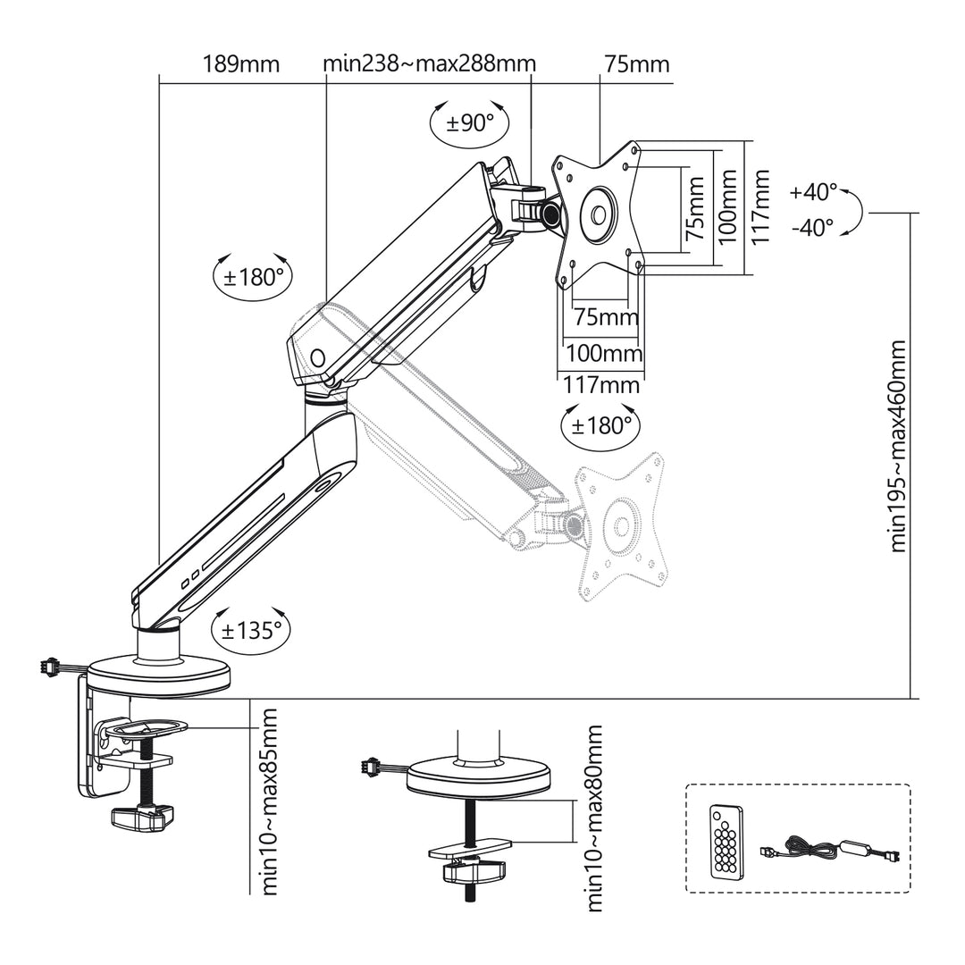 Egy kiváló minőségű anyagokból készült kar, amely egy stabil tartóval van felszerelve az asztallapra vagy más sík felületre történő rögzítéshez, valamint egy rögzítőelemmel a tartó kábelnyílásba történő rögzítéséhez.