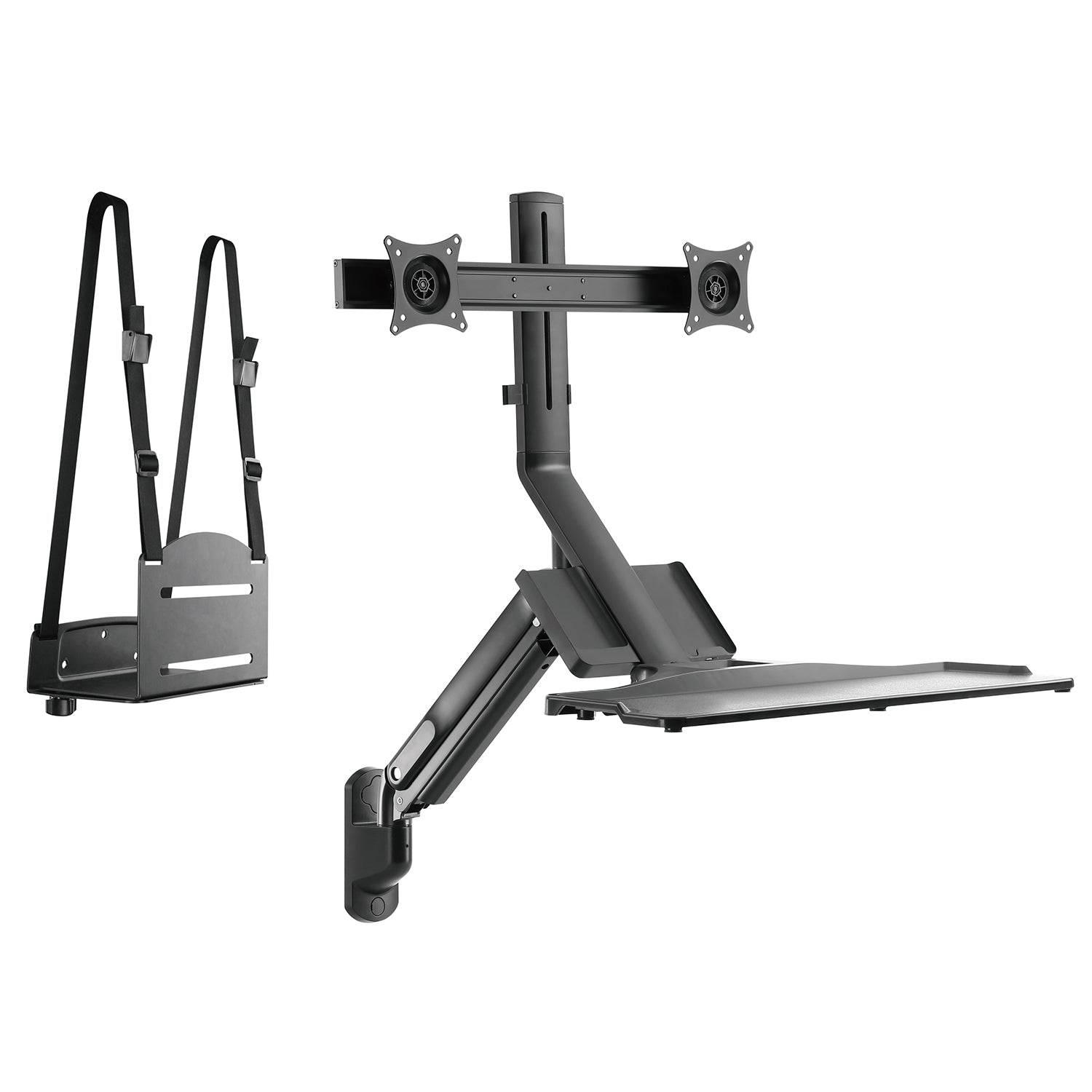 Univerzális falra szerelhető munkaállomás két monitor és egy billentyűzet tartójával, amely lehetővé teszi, hogy íróasztal nélkül dolgozhasson a számítógépén.