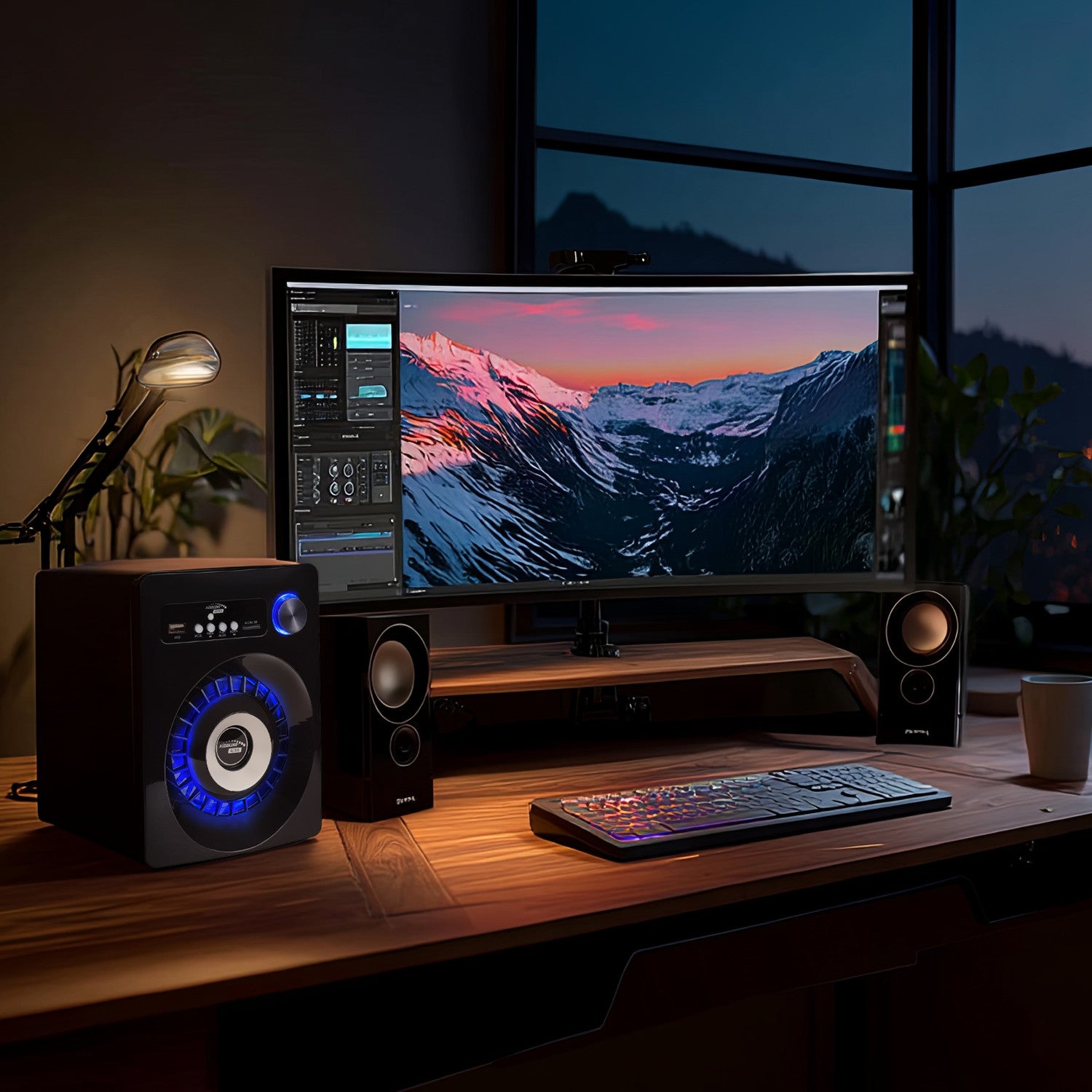 egy 2.1-es hangszórókészlet, amely vonzó és modern dizájnnal rendelkezik. Az itt bemutatott Audiocore AC910 hangszórókészlet két szatellit hangszóróból áll, amelyek sztereó hangzást biztosítanak, valamint egy mélyhangszóróból, amely a basszus reprodukcióért felelős. A mélysugárzó elején található forgatógomb segítségével könnyen beállítható az egész szett hangereje. A hangszórók esztétikailag is lenyűgözőek. A zongora fekete szín elegáns megjelenést kölcsönöz, a kék LED háttérvilágítás pedig karaktert kölcsönöz a hangszóróknak.
