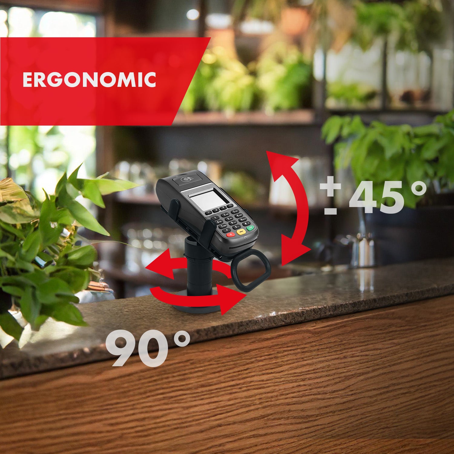 A kialakítás lehetővé teszi a terminál 90°-kal történő elforgatását az ügyféllel való egyszerűbb interakció érdekében.