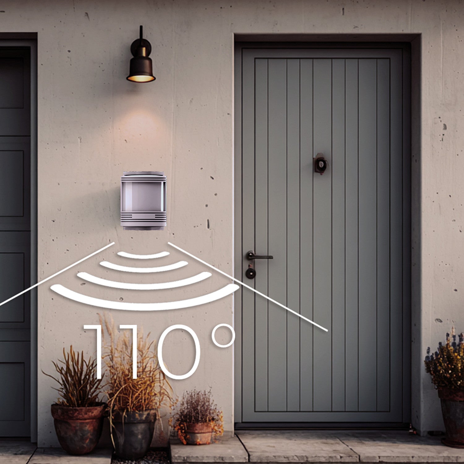 Az érzékelő 4 méter távolságból és 110°-os szögben érzékeli a mozgást, kompakt méreteinek és akkumulátoros tápellátásának köszönhetően pedig gyakorlatilag bárhová felszerelhető - nem kell hálózati áramot vagy kábeleket húzni!
