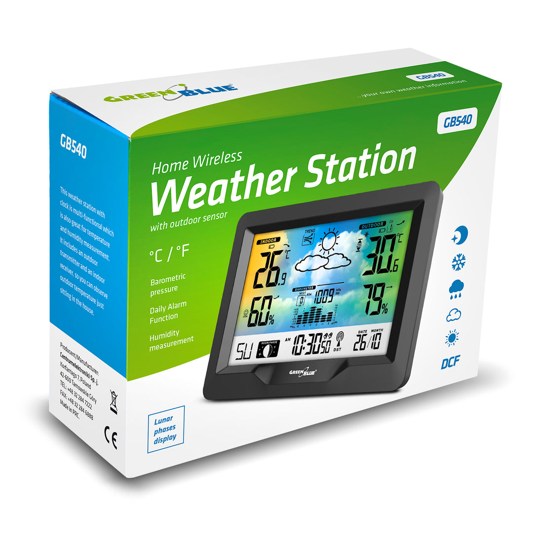 GreenBlue GB540 vezeték nélküli színes időjárás-állomás DCF, holdfázisokkal, barométerrel, naptárral