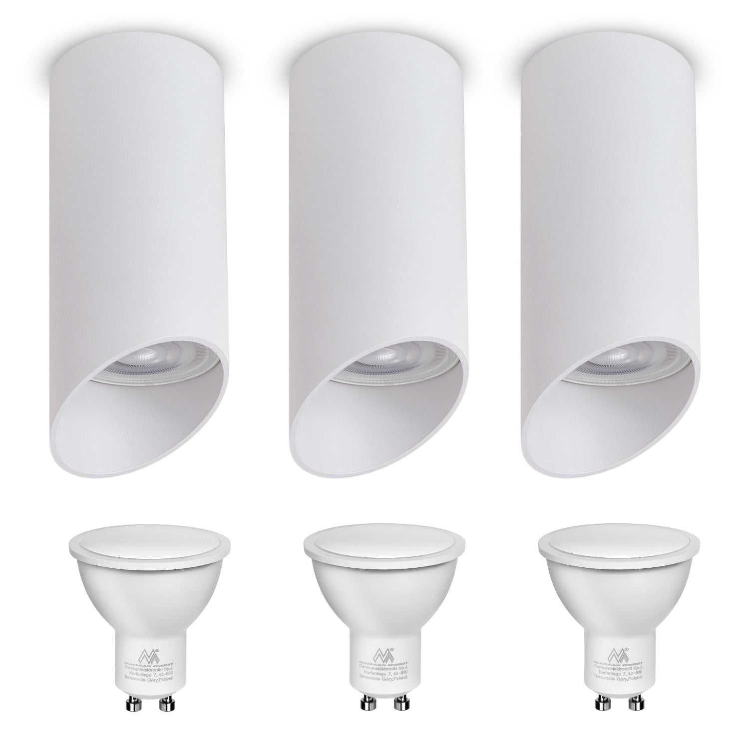 Maclean felszíni lámpatest/cső, spot, kerek, alumínium, GU10, 55x130mm, fehér, MCE360 W 3db+LED izzó GU10 7W Maclean Energy MCE437 NW semleges fehér 4000K, 220-240V~, 50/60Hz 3db