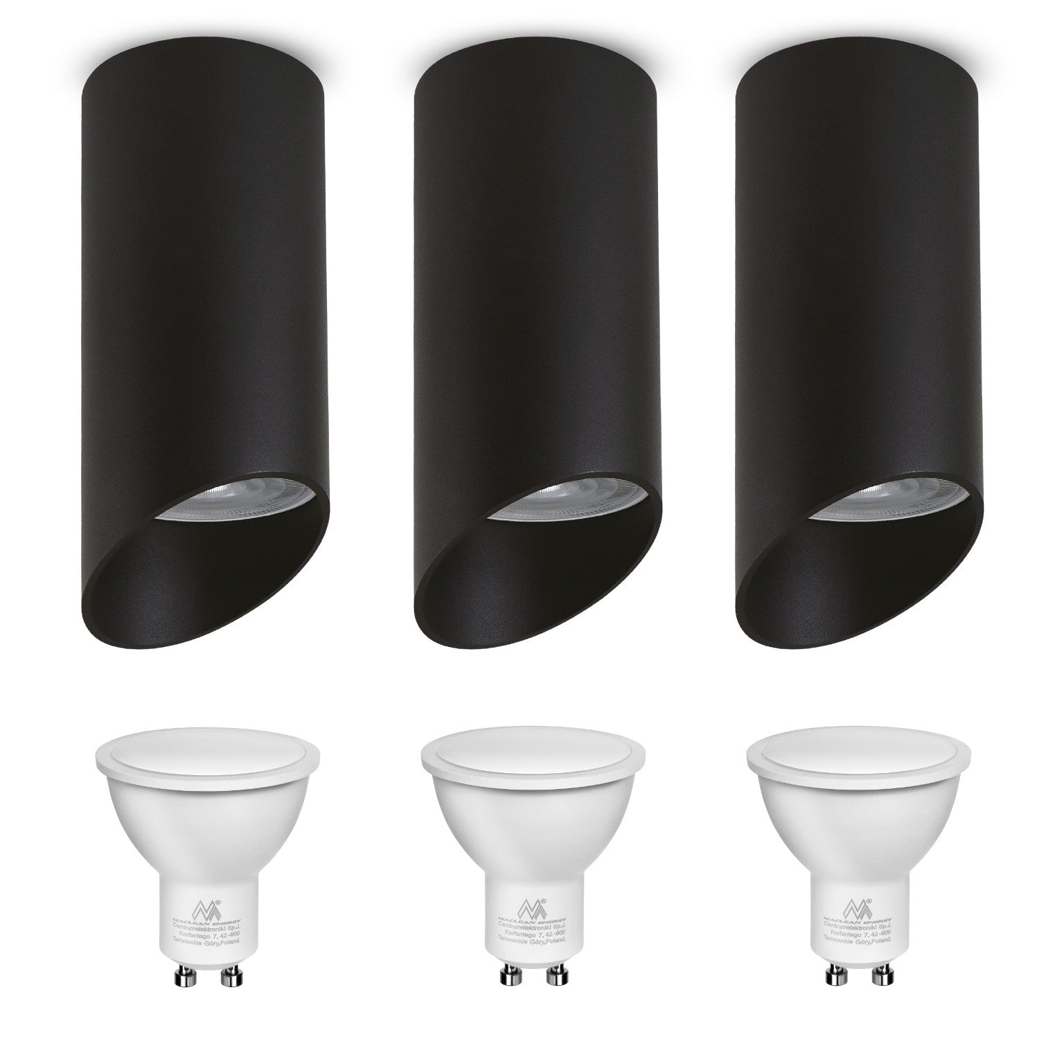 Maclean felszíni lámpatest/cső, spot, kerek, alumínium, GU10, 55x130mm, fekete színű, MCE360 B 3db + LED izzó GU10 7W Maclean Energy MCE437 WW meleg fehér 3000K, 220-240V~, 50/60Hz, 3db