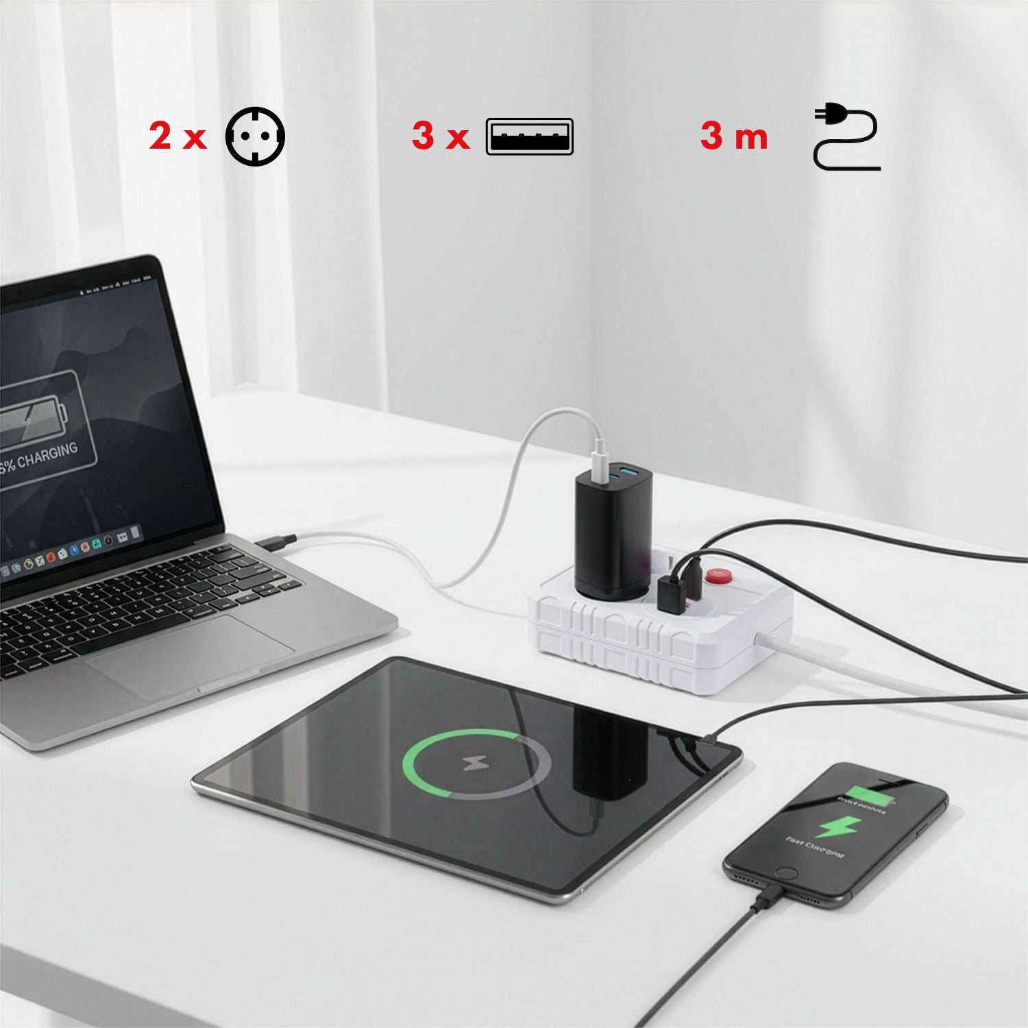 A két hálózati aljzat lehetővé teszi a leginkább szükséges eszközök, például laptop, monitor, asztali lámpa vagy hangszórók áramellátását, míg a három USB-port lehetővé teszi a mobileszközök gyors töltését további adapterek nélkül. Ez ideális megoldás kisebb helyiségekbe, ahol a funkcionalitásra kompakt formában van szükség.