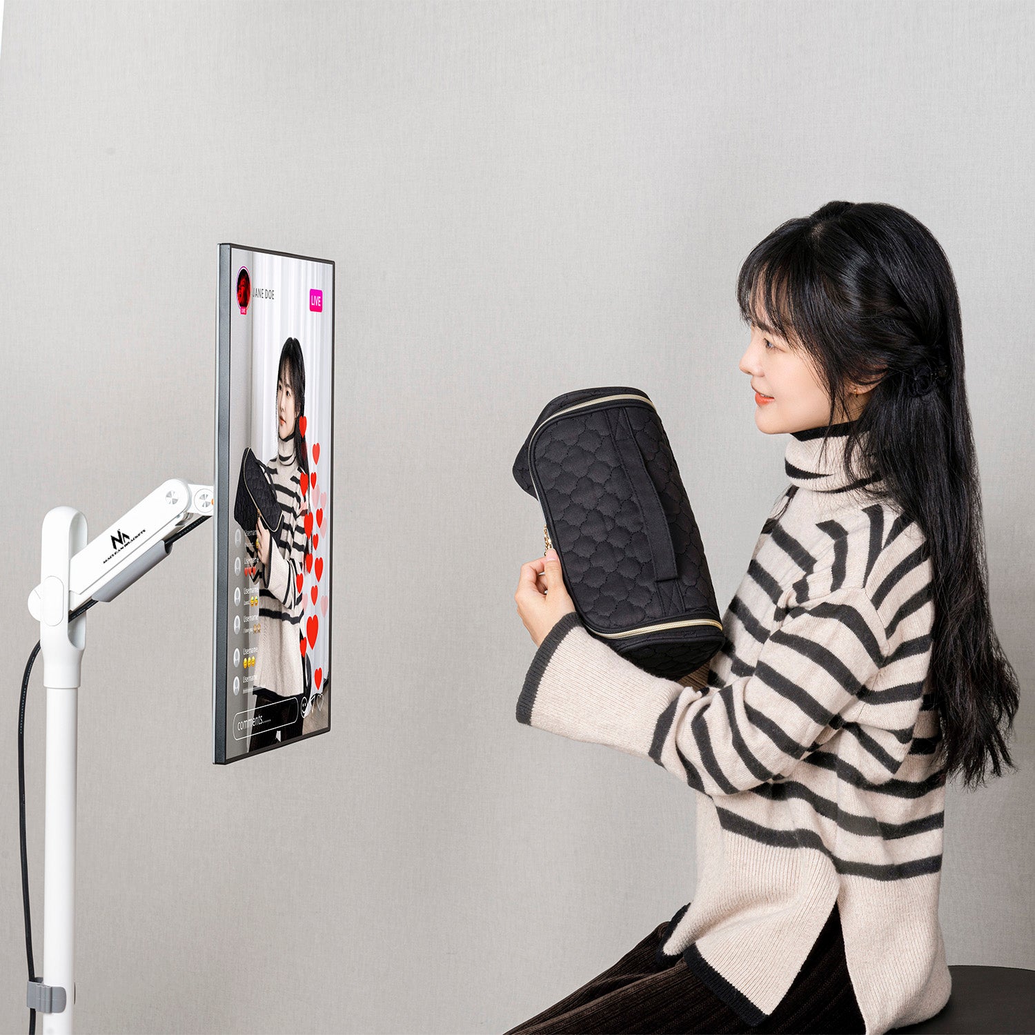 A talapzatban elrejtett görgők segítségével az állvány könnyen mozgatható bármilyen helyre. Az állvány kábelátvezetőkkel is fel van szerelve.
