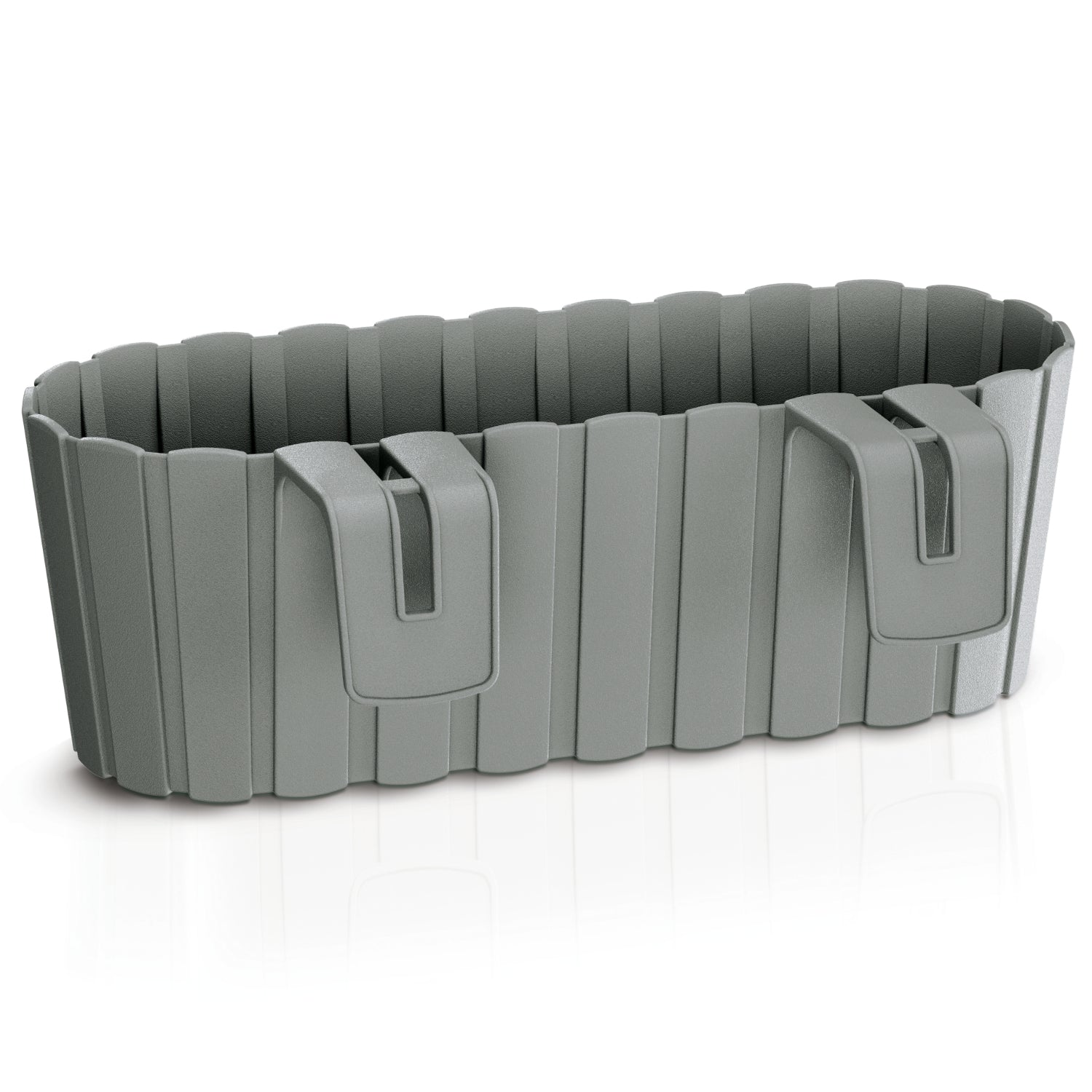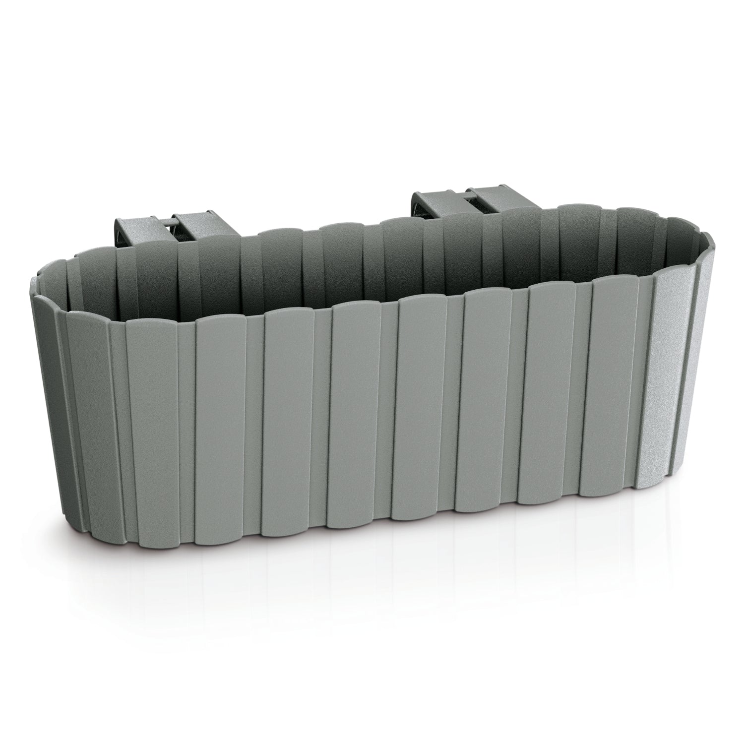 Ovális erkélydobozok korlátra akasztáshoz. A kis deszkákból készült edényekre emlékeztető egyszerű forma egyedi kifejezést kölcsönöz a térnek.