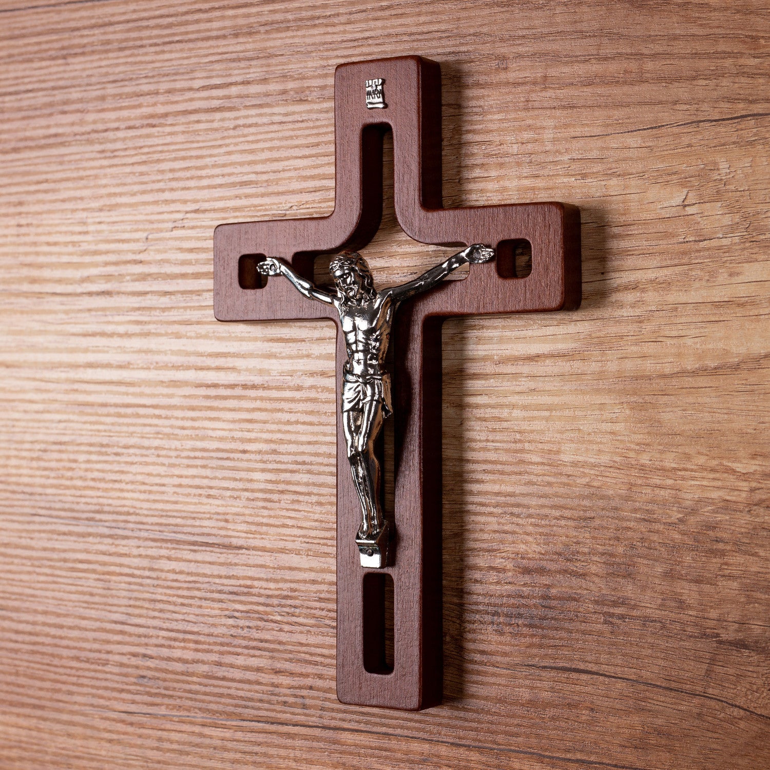 Fából készült lógó kereszt, modern, barna 18x12x1.4cm