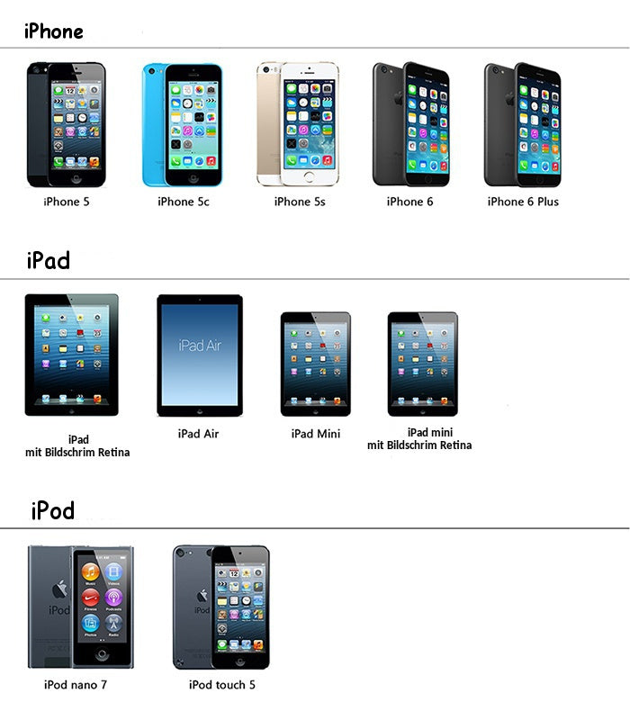 iPhone 4 / 4S, 5 / 5S, 5C, Iphone 6, iPad Air / 2 / Mini, iPad 2/3/4 vagy Samsung Galaxy S3, S4, S5, Sony Xperia Z, LG G2, HTC ONE, Nokia, Huawei még sok más (köszönhetően az USB töltőkészülékeknek a megfelelő kábel használata után!)!