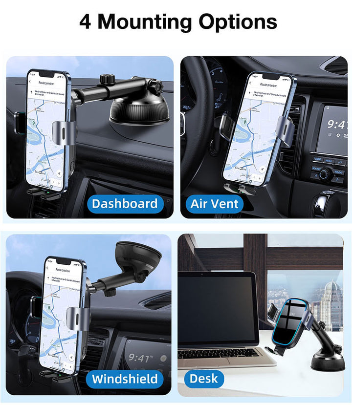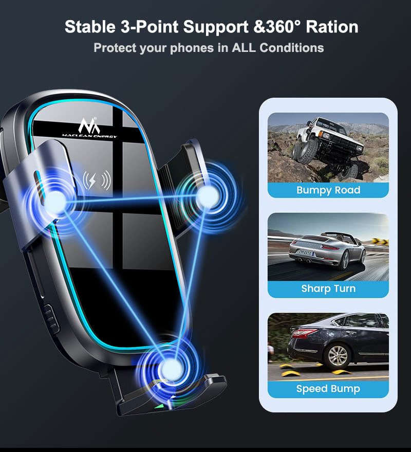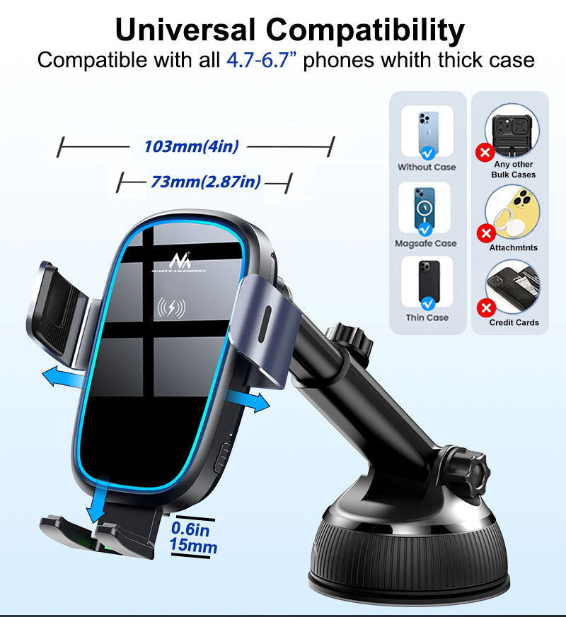 Az alkalmazott közelség- és gravitációs érzékelőknek köszönhetően az okostelefon automatikusan a töltőállomáshoz csatlakozik, és gyorsan megkezdi a töltést. Még göröngyös úton is a töltőállomáshoz rögzítve marad. Nemcsak a legújabb iPhone-okkal, hanem minden Qi-t támogató okostelefonnal működik! A Maclean MCE129 töltő akár 15 W kimeneti teljesítményével megbízhatóan és gyorsan tölti iOS vagy Android készülékét vezeték nélkül. A különböző kimeneti teljesítmények lehetővé teszik, hogy a különböző készülékeket a megfelelő energiával táplálhassa. Egyszerűen helyezze a készülék hátoldalát a töltőhöz, a beépített érzékelők pedig érzékelik a készüléket, és automatikusan "rögzítik" az alumínium karokat, és az optimális pozícióban rögzítik a készüléket. Kétféle rögzítési lehetőség közül választhat. A mellékelt szellőzőklipsz segítségével biztonságosan rögzítheti az MCE129-et a legtöbb szellőzőnyílásba. Ha a klipsz nem illeszkedik a lamellához, egyszerűen rögzítse a készüléket a nagy tapadókorong segítségével a jármű szélvédőjére vagy műszerfalára. A két tartó praktikus gömbcsuklói lehetővé teszik a telefon 360°-os elforgatását. Így könnyedén beállíthatja a kijelzőjének legkényelmesebb és legoptimálisabb betekintési szögét. Egy hozzá illő, akár 1,5 m hosszú USB-C kábelt is tartalmaz.