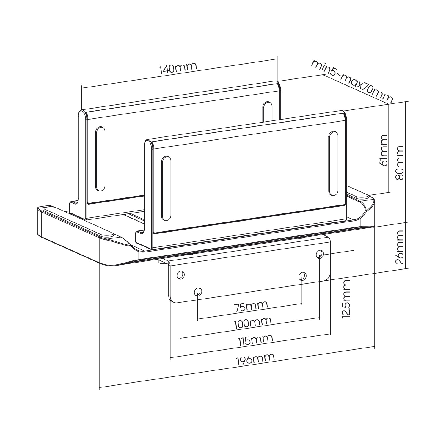 A konzol állítása lehetővé teszi az 5 és 70 mm közötti szélességű eszközök rögzítését.