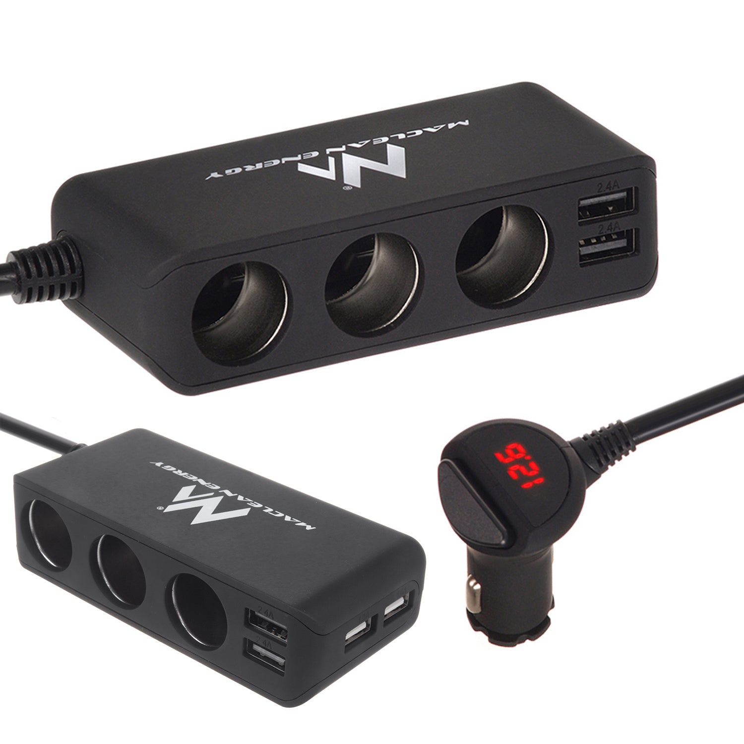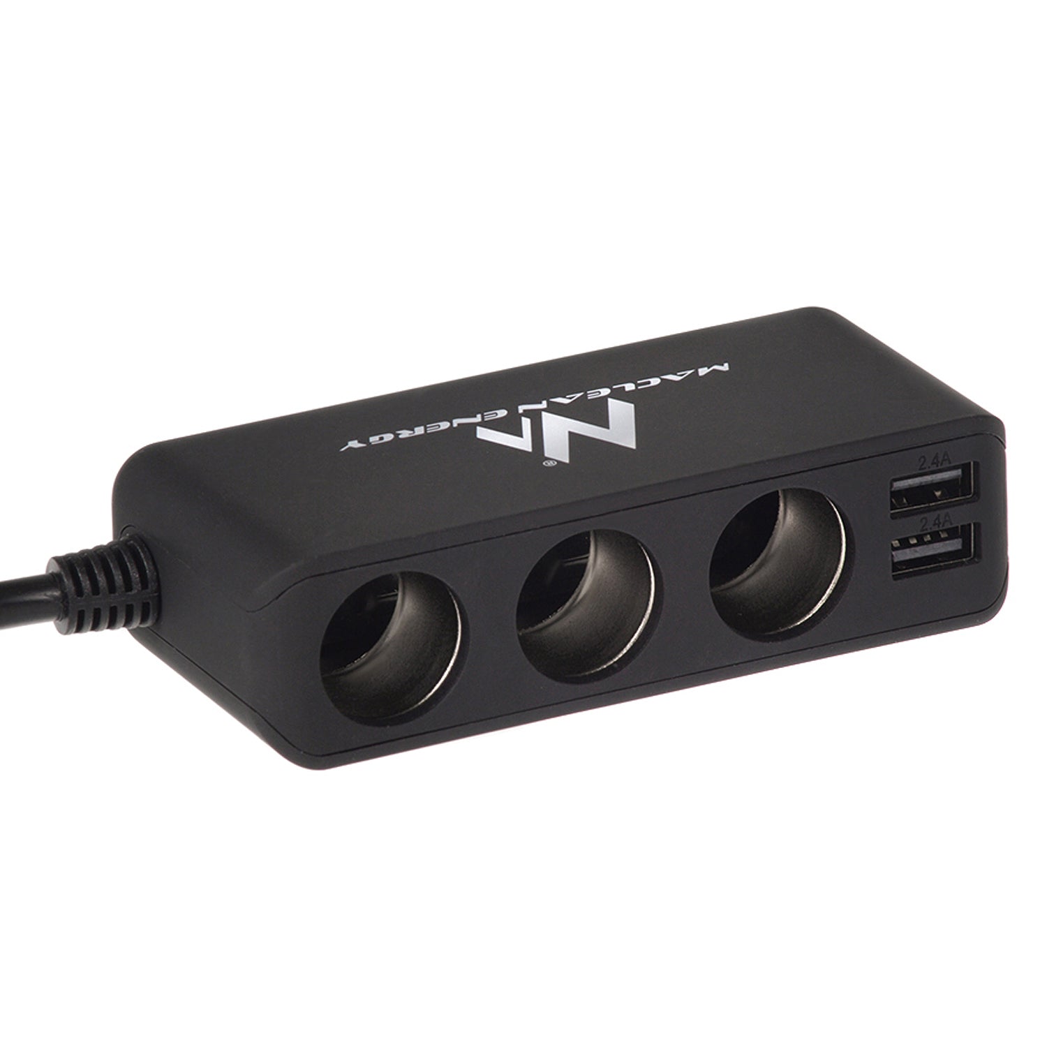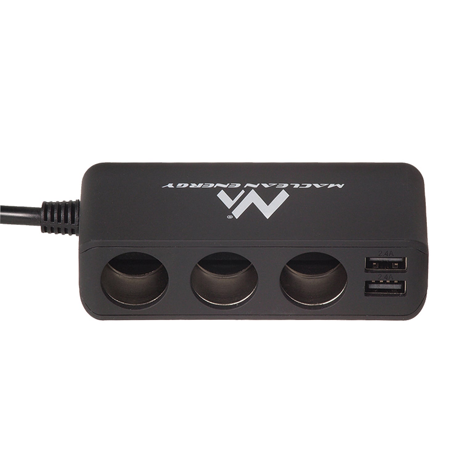 Maclean autógyújtó aljzat elosztó, feszültségmérő, 3 gyújtó aljzat, 2 első csatlakozó 2 x 2,4A , 2 oldalsó csatlakozó 2 x 1A, max 120W, fekete, gumírozott, MCE117