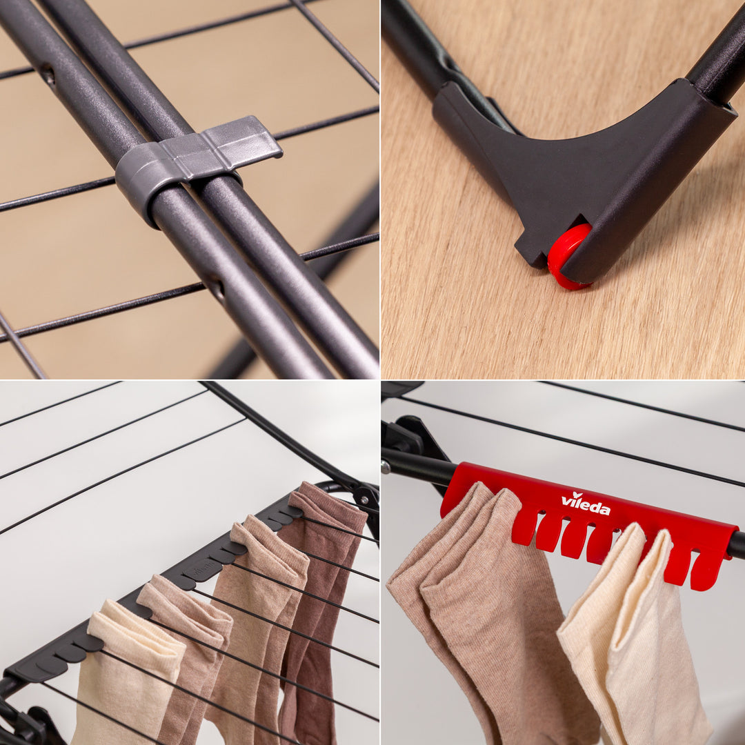 A Vileda Universal Ultimate szárító elegáns matt fekete színben, piros kiegészítőkkel elegáns megoldást kínál a ruhák szárításához.BIZTONSÁGOS, KOMPAKT ÉS EGYSZERŰ HASZNÁLAT