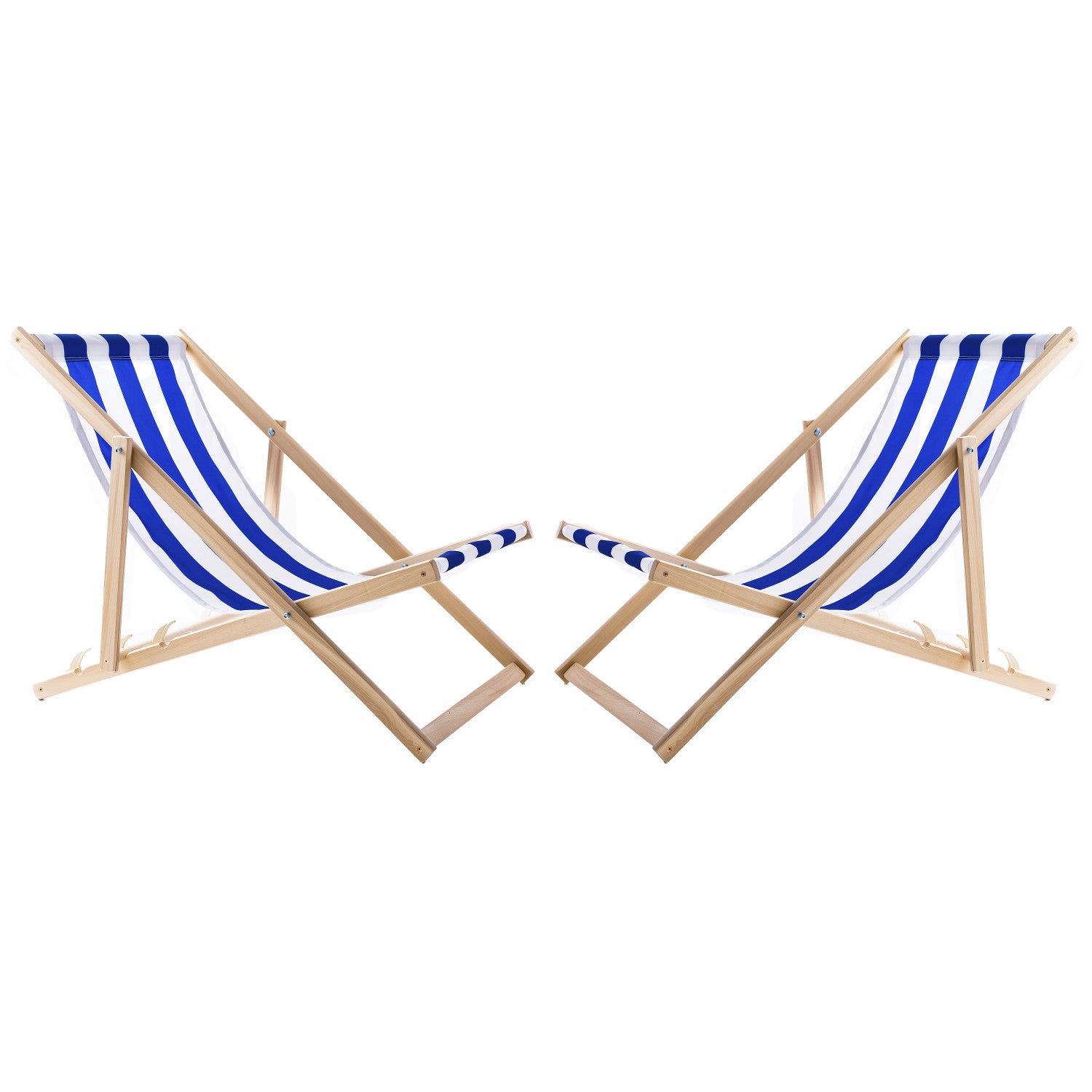 2 kényelmes fa nyugágy, kék csíkos, ideális a strandra, erkélyre, teraszra, összeállítva.