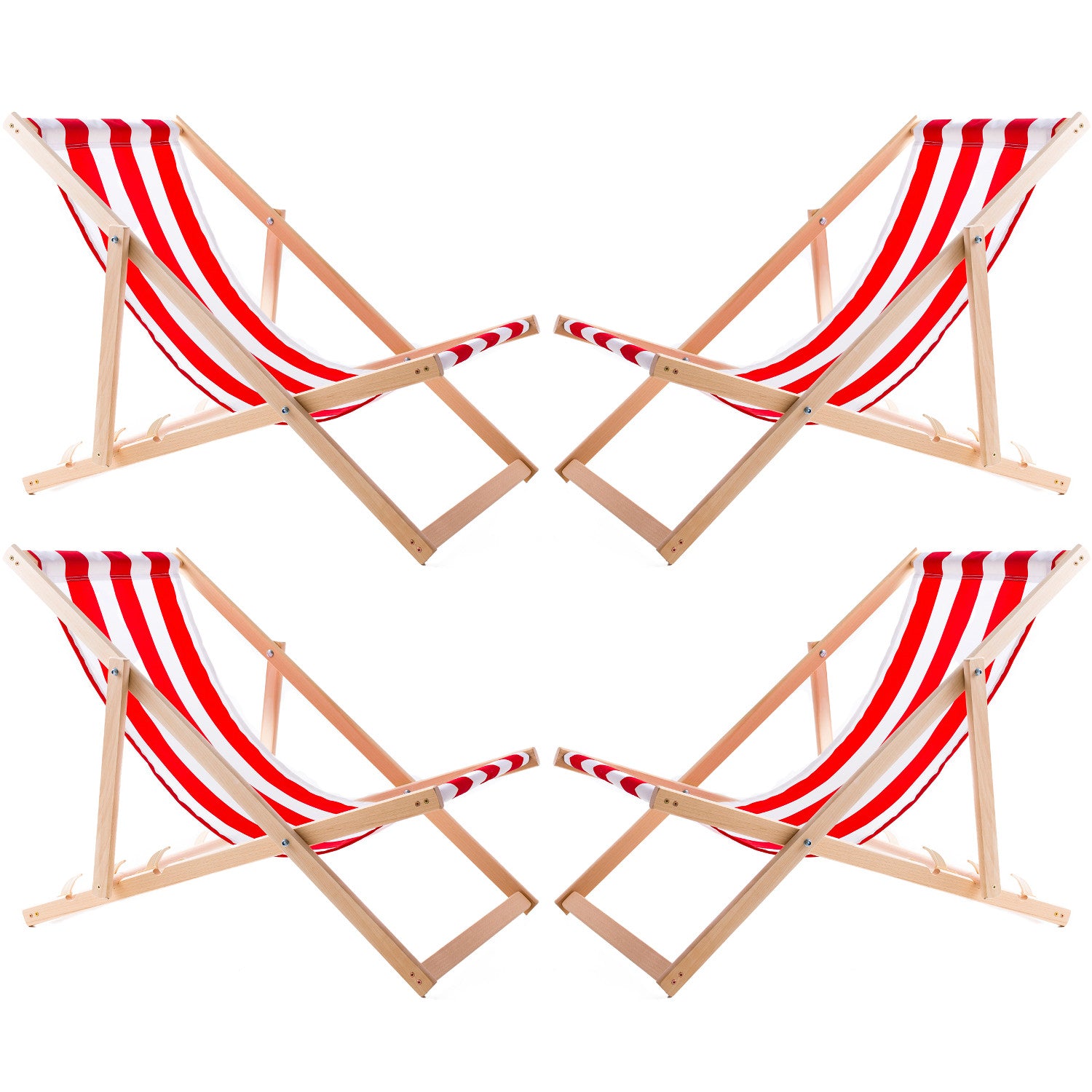 4 kényelmes fa nyugágy, piros csíkos, ideális strandra, erkélyre, teraszra, összeállítva.