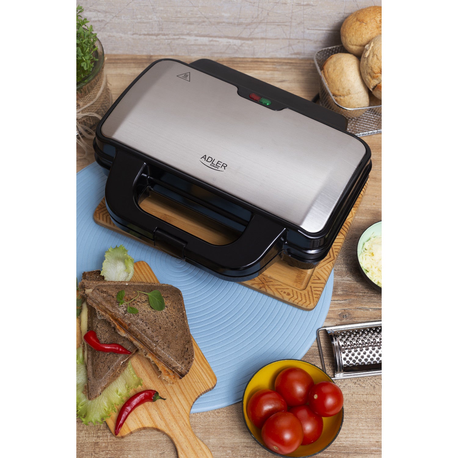 Az ADLER AD 3043 szendvicspirító egy olyan készülék, amelynek minden konyhában ott kell lennie. Ez egy kényelmes termék, amely lehetővé teszi, hogy meleg vacsorát vagy harapnivalót készítsen amerikai XXL szendvicsek formájában. Ez egy érdekes alternatívája a hagyományos háromszögletes pirítósnak, amely jól működik nagycsaládosok vagy az ilyen típusú snackek szerelmesei számára. Ki ne enne közülünk egy meleg szendvicset húzott sárga sajttal!