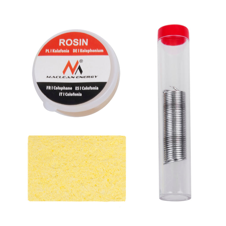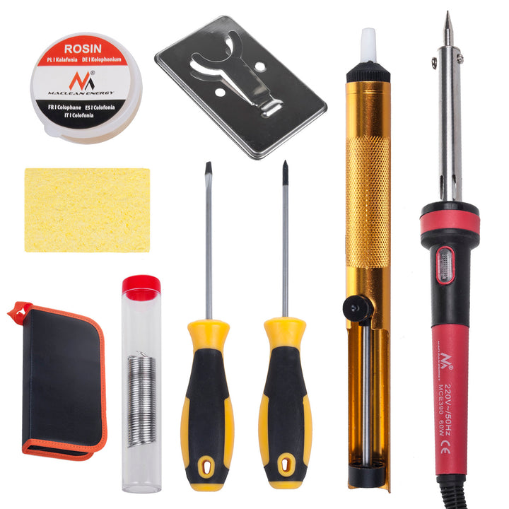 Maclean forrasztókészlet, 60W földelt grotto/ellenállás, ón, gyanta, gyanta, kioldó, állvány, csavarhúzók, hordtáska, MCE390
