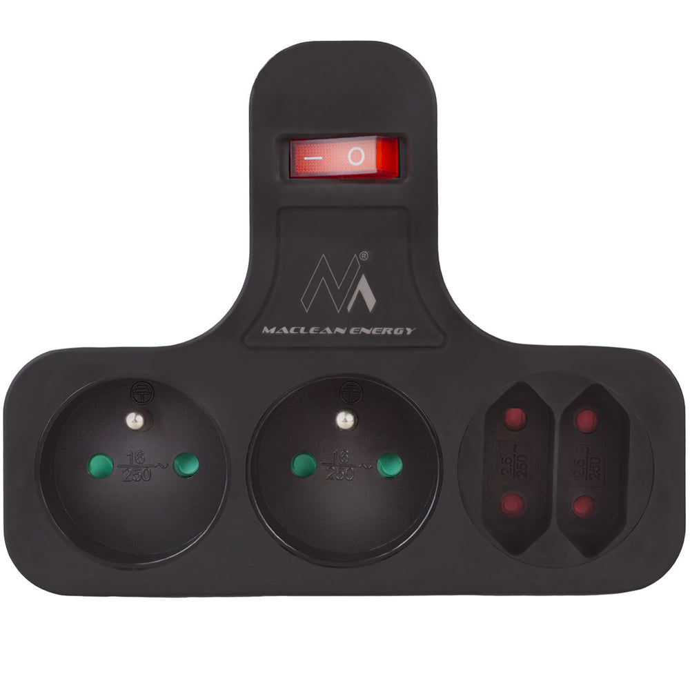 Maclean konnektor, négyszeres, be-/kikapcsolóval, stabilizáló láb, E típus, 2x2,5A, 2x16A, MCE224 E/B