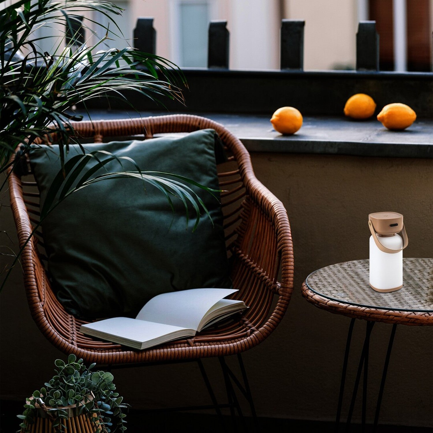 A lámpa lámpaszerű kialakításának köszönhetően IP44-es védettséggel rendelkezik, így biztonságosan használható a teraszon vagy a kertben. Beépített LED-es fényforrással rendelkezik, amelynek fényereje és színhőmérséklete egy érintésérzékeny kapcsolóval állítható. Beépített újratölthető akkumulátorral rendelkezik, amely USB-C kábellel 3 óra alatt feltölthető, és teljesen feltöltve 10 órán át tart. A LED technológiának köszönhetően ez a modell hosszú élettartammal rendelkezik.