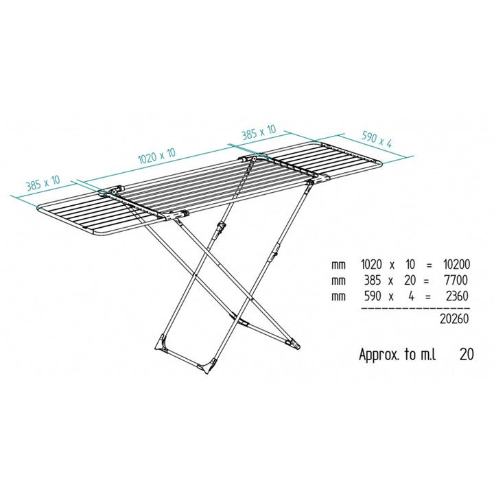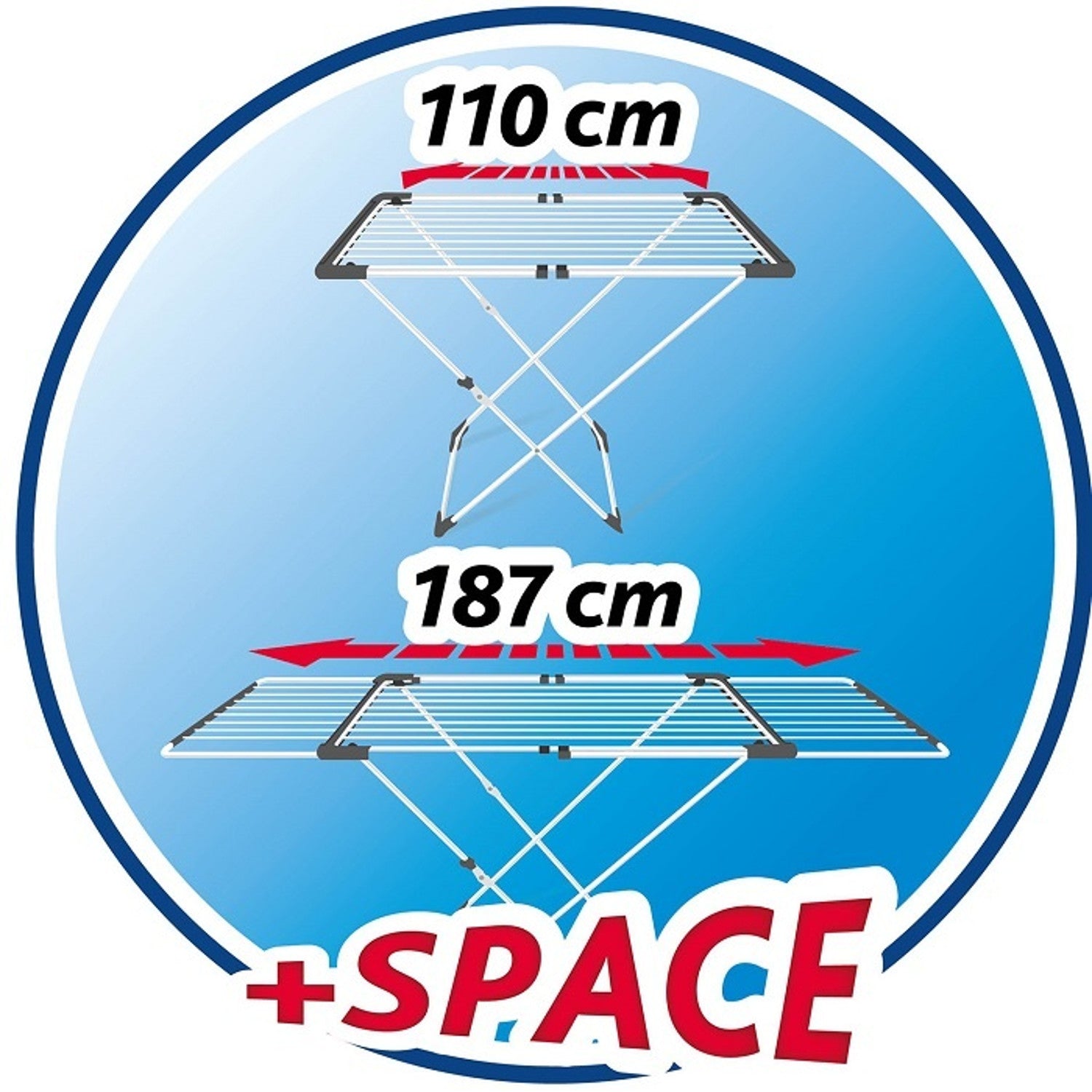 A két egymást átfedő, független állványnak köszönhetően lehetővé teszi a szennyes bármilyen stabil elhelyezését. Vastagabb kötelekkel is fel van szerelve a szennyes könnyebb szárítása és a gyűrődések elkerülése érdekében.